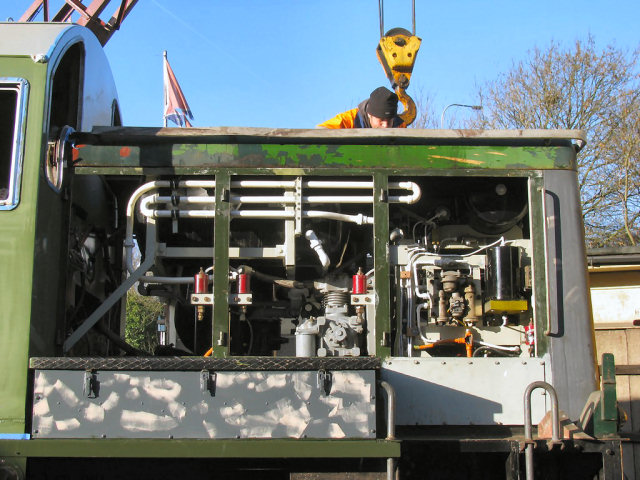 A frosty 'B' End roof section stood against the shed (left) and being craned onto the loco (right) ...