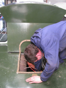 Dave & Tom took over cleaning off the cab window frames while Jason went inside the cab and set about finding and fitting screws for the instrument gauges in the control desk. Alan soon returned from the support coach with a fettled governor and with help from James Bottomley set about refitting it to the loco. Carl holt was on site again, making adjustments to the fuel pumps.