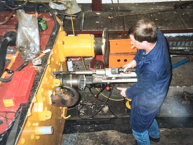 Drilling through the 6 inches of buffer beam underway, the drilling rig is held on the bufferbeam using a mains powered electro-magnet! ...