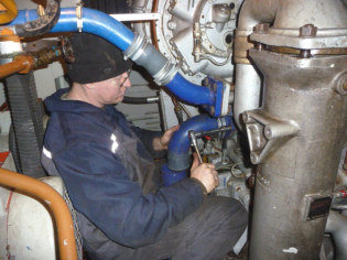 Adam and Jason continued with the cooling system. Alan had mentioned about a leak from one of the breather pipes so Adam fixed that. Jason meanwhile reconnected the heat exchanger and associated pipework. With the system back together the coolant was pumped back into the loco.