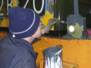 Mark sanded down and then painted the yellow wasp stripes while Colin made a start on painting the buffer beam side panels in black gloss. After that Colin gave the marker lights a light sanding down before applying undercoat.